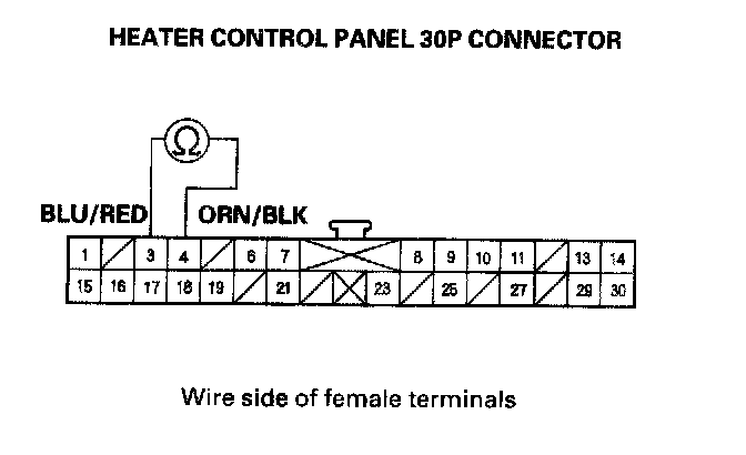 11. Measure the resistance between the No. 3 and No. 4 terminals of the heater control panel 30P connector.