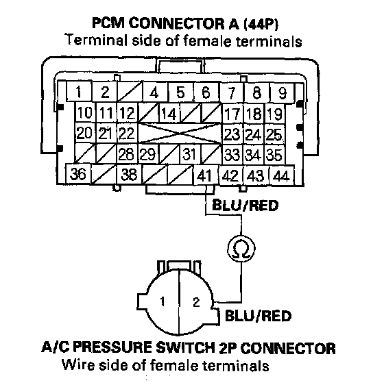 14. Check for continuity between the No. 41 terminal of PCM connector A (44P) and No. 2 terminal of the A/C pressure switch 2P connector.