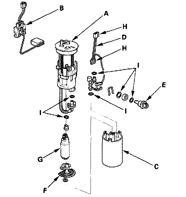 3. When connecting the fuel pump assembly, make sure the connection is secure and the suction filter (F) is firmly connected to the fuel pump (G).
