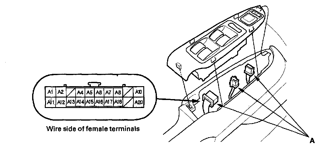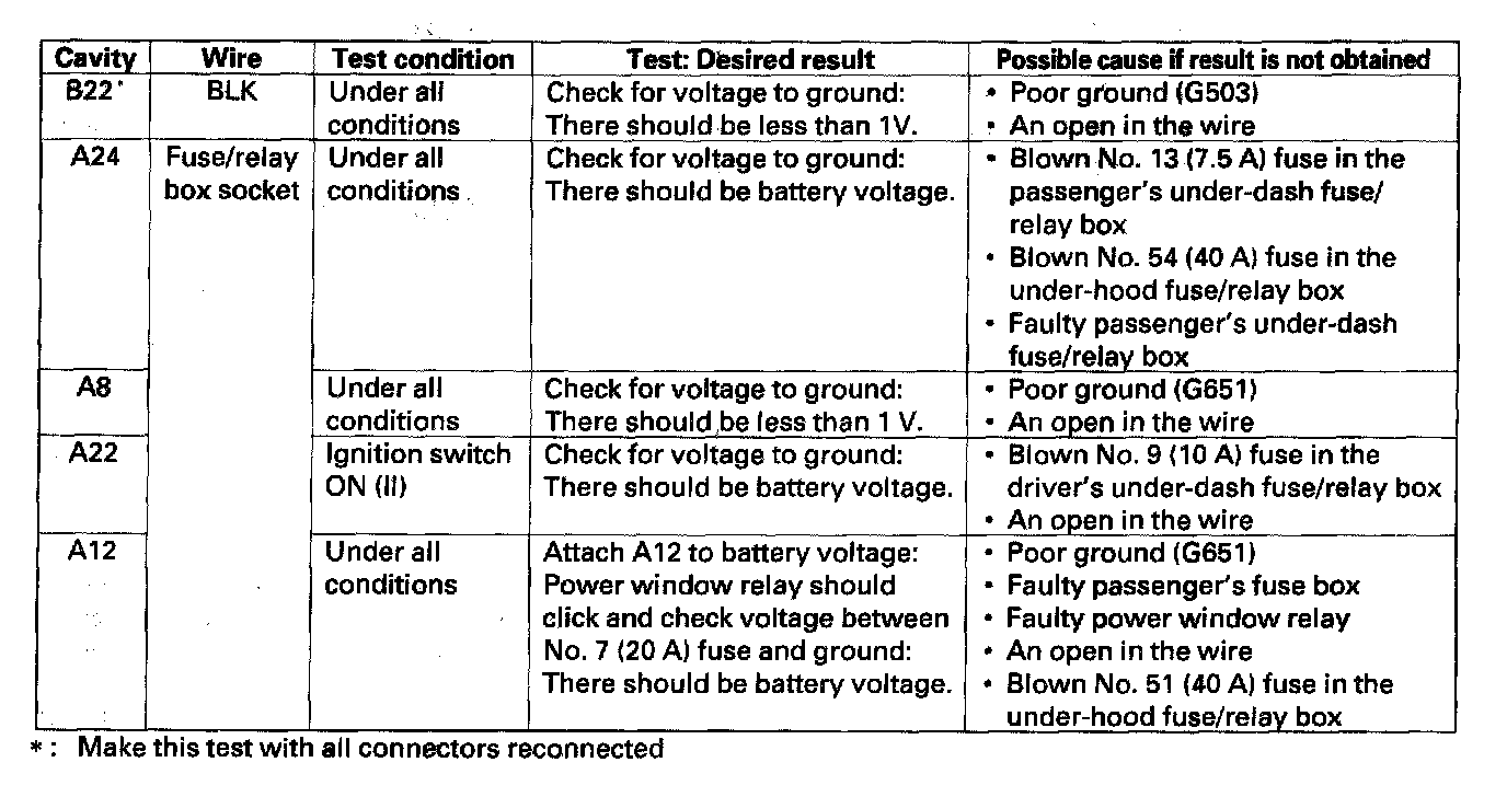 10. Make the following input tests at 22P connector B and the driver's under-dash fuse/relay box socket connector A. Be careful not to spread the fuse box connectors.