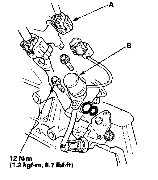 3. Remove the VTEC solenoid valve/oil filter assembly (A) from the oil pump, and check the VTEC solenoid valve filter (B) for clogging. If there is clogging, replace the VTEC solenoid valve filter, the engine oil filter, and the engine oil.