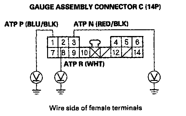 5. Shift to the P position, and check for voltage between gauge assembly connector terminal C1 (BLU/BLK) and body ground. There should be 0 V in the P position. There should be battery voltage in any other shift lever position.