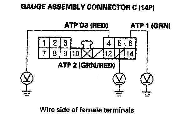 10. Shift to the 2 position, and check for voltage between terminal C5 (GRN/RED) and body ground. There should be 0 V in the 2 position. There should be battery voltage in any other shift lever position.