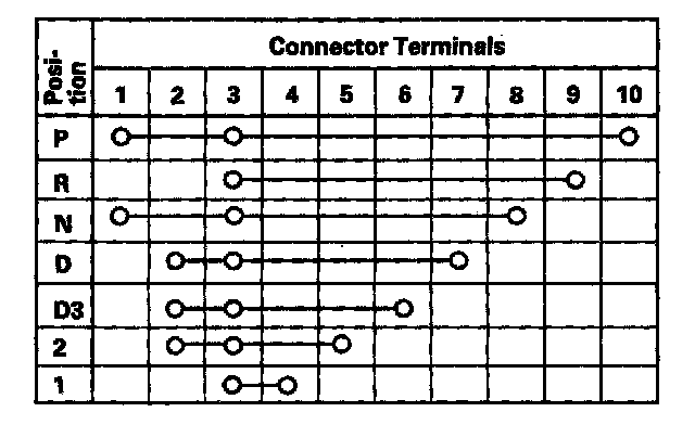 3. If there is no continuity between any terminals, check the transmission range switch installation. If the installation is OK, replace the switch.