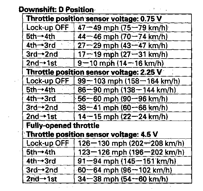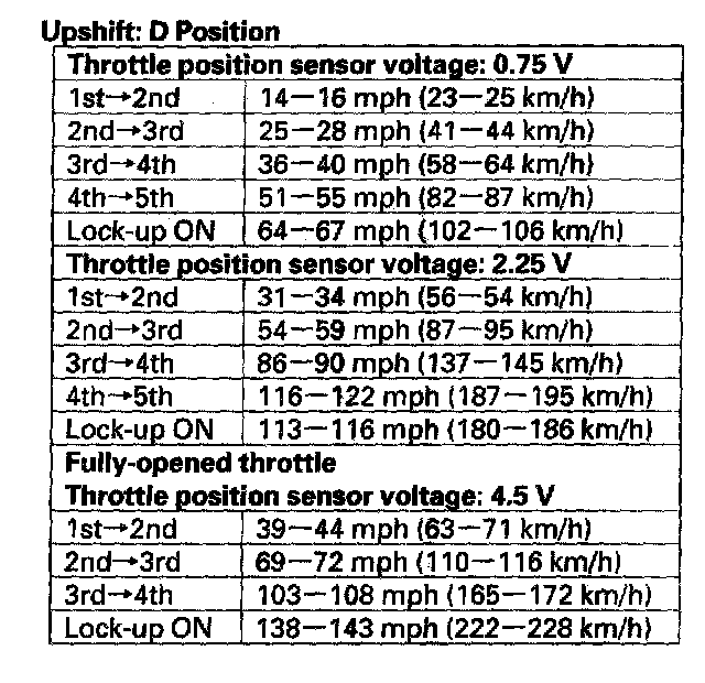 5. Test-drive the vehicle on a flat road in the D position. Check for abnormal noise and clutch slippage. While driving, check that the shift points occur at the proper speeds by monitoring the throttle position sensor voltage with the HDS and comparing your shift point speeds and voltage to those in the table. (The throttle position sensor voltage represents the throttle opening.)