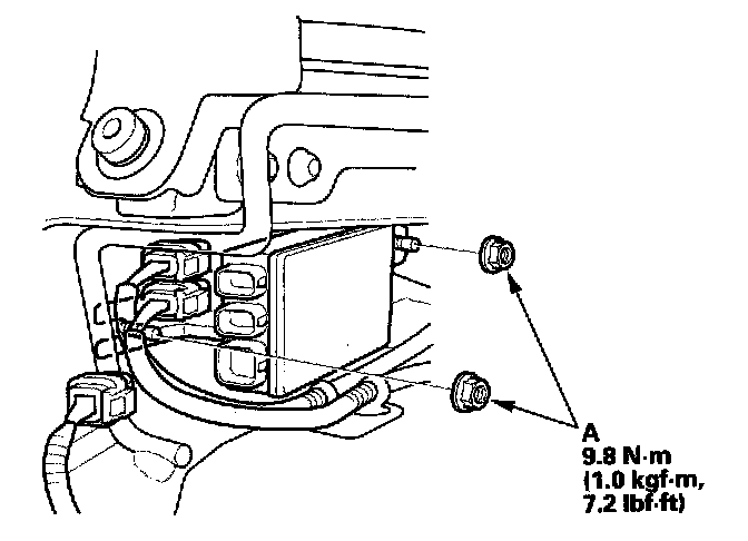 1. Place the new front passenger's weight sensor unit on the seat riser. Tighten the two mounting nuts (A) and connect the connectors.