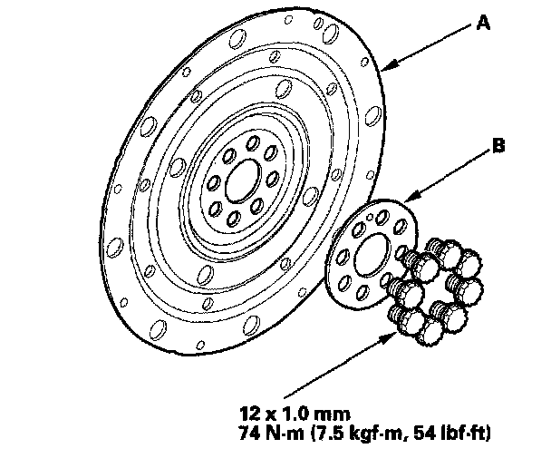 Install the drive plate and washer on the engine crankshaft, and tighten the eight bolts in a crisscross pattern.