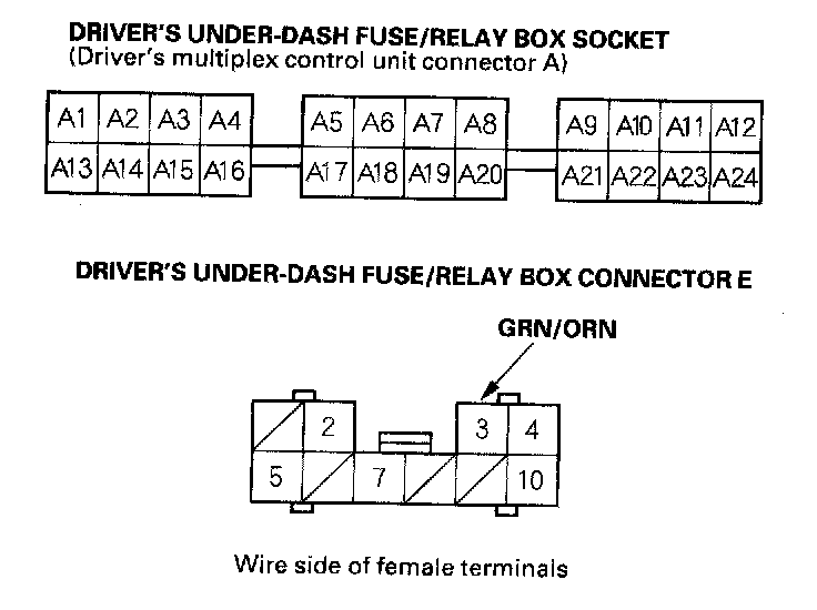 7. With the driver's multiplex control unit still disconnected, make these input tests at the driver's under-dash fuse/relay box socket.