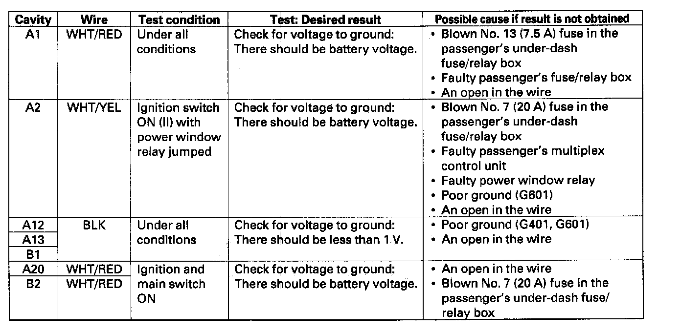 4. With the passenger's multiplex control unit still disconnected, make these input tests at the passenger's under-dash fuse/relay box socket.