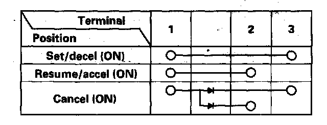 - If there is continuity, and it matches the table, but switch failure occurred on the cruise control input test, check and repair the wire harness on the switch circuit.