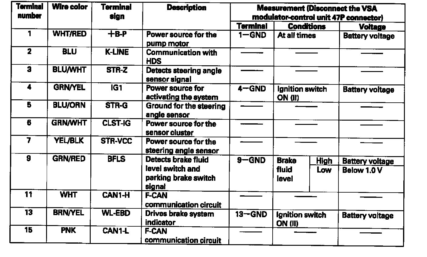 VSA Modulator-Control Unit Inputs and Outputs for 47P Connector: