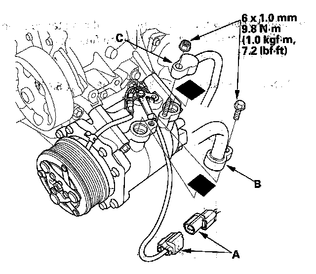 7. Disconnect the A/C compressor clutch connector (A), remove the bolt and nut, then disconnect the suction line (B) and the discharge line (C) from the A/C compressor. Plug or cap the lines immediately after disconnecting them to avoid moisture and dust contamination.
