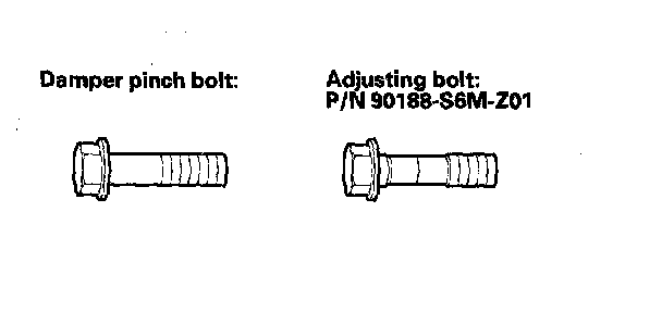 NOTE: The camber angle can be adjusted up to ±15' (center of tolerance) by replacing one damper pinch bolt with the adjusting bolt. The camber angle can be adjusted up to ±30' by replacing both upper and lower damper pinch bolts with the adjusting bolts.