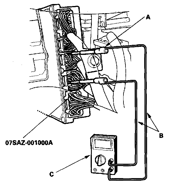 1. Connect the backprobe adapters (A) to the stacking patch cords (B), and connect the cords to a digital multimeter (C).