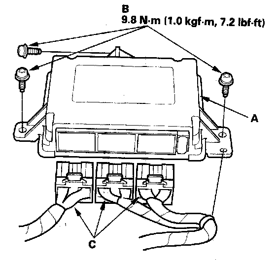 1. Install the new SRS unit (A) with Torx bolts (B), then connect the connectors (C) to the SRS unit; push them into position until they click.