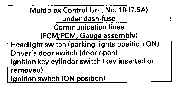 When the ignition switch is turned ON (II), the multiplex control unit, gauge assembly, and ECM/PCM wake up at the same time without "talking" to each other through the communication lines. When any switch in the multiplex system is turned on, it wakes up its related control unit which, in turn, wakes up the other units.