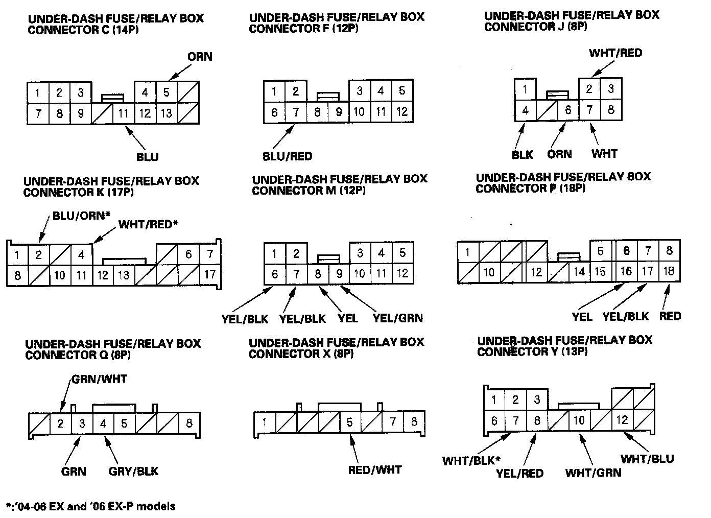 2. Disconnect the under-dash fuse/relay box connectors C, F, J, K, M, P, Q, X and Y.