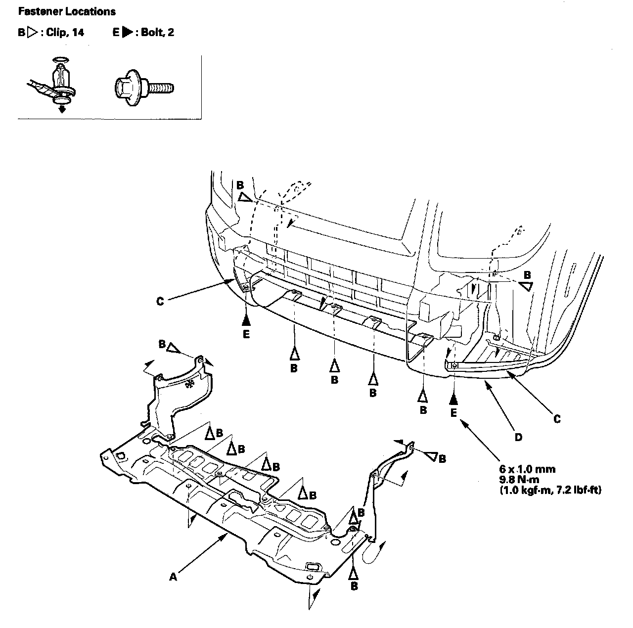 2. From under the front bumper (D), remove the clips (B) and bolts (E).