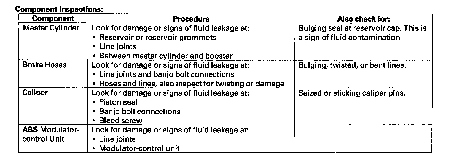 Brake System inspection and TestInspect the brake system components listed. Repair or replace any parts that are leaking or damaged.