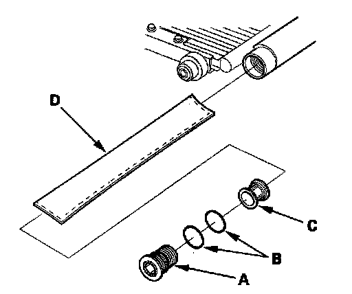 2. Remove the cap (A) from the bottom of the A/C condenser, then remove the O-rings (B), the filter (C) and the desiccant (D).