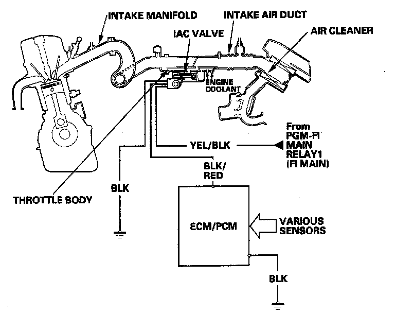 When the engine is cold, the A/C compressor is on, the transmission is in gear, the brake pedal is pressed, the power steering load is high, or the alternator is charging, the ECM/PCM controls current to the idle air control (IAC) valve to maintain the correct idle speed. Refer to the system diagram to see the functional layout of the system.