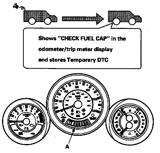 During the first drive cycle after a cold start, the ECM/PCM alerts the driver to check the fuel fill cap by showing a "CHECK FUEL CAP" message in the odometer/trip meter display (A), and it stores Temporary DTC P0457 "Evaporative Emission (EVAP) System Leak Detected/Fuel Fill Cap Loose or Missing" tightening the fuel cap does not make the message go off immediately.
