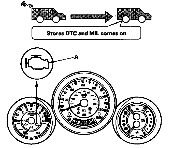 During the third drive cycle after a cold start, if the fuel fill cap is still loose or missing, the ECM/PCM stores DTC P0457 "Evaporative Emission (EVAP) System Leak Detected/Fuel Fill Cap Loose or Missing". The malfunction indicator lamp (MIL) (A) comes on, and the "CHECK FUEL CAP" message goes off.