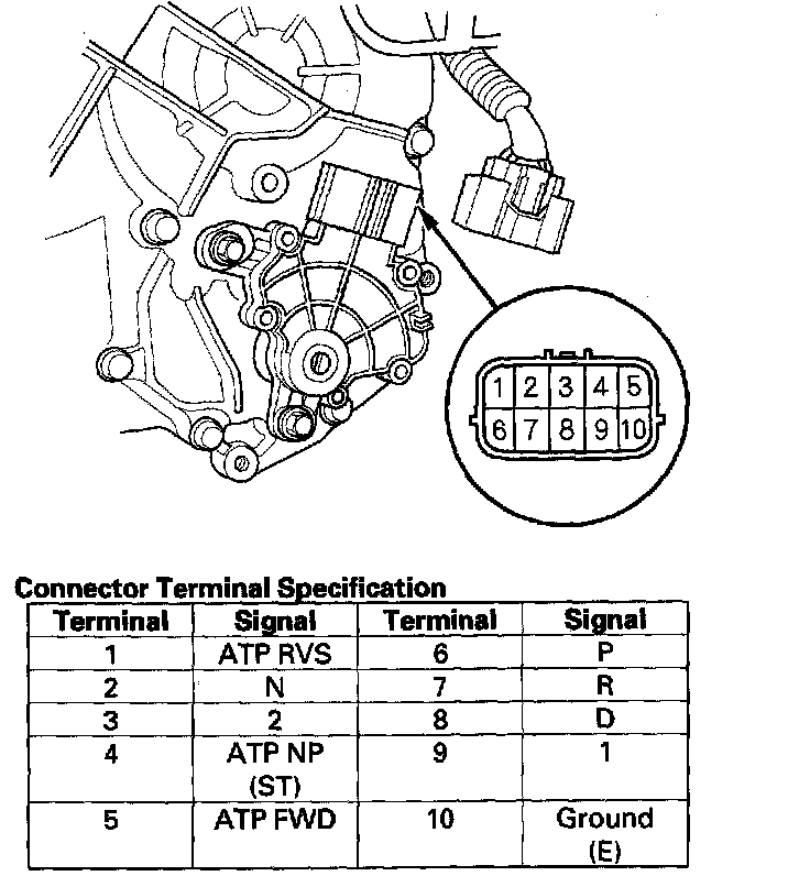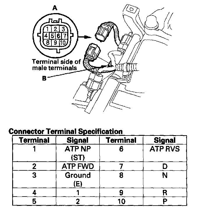 Transmission Range Switch Test1. Remove the transmission range switch harness connector (A) from the connector bracket (B), then disconnect the connector.