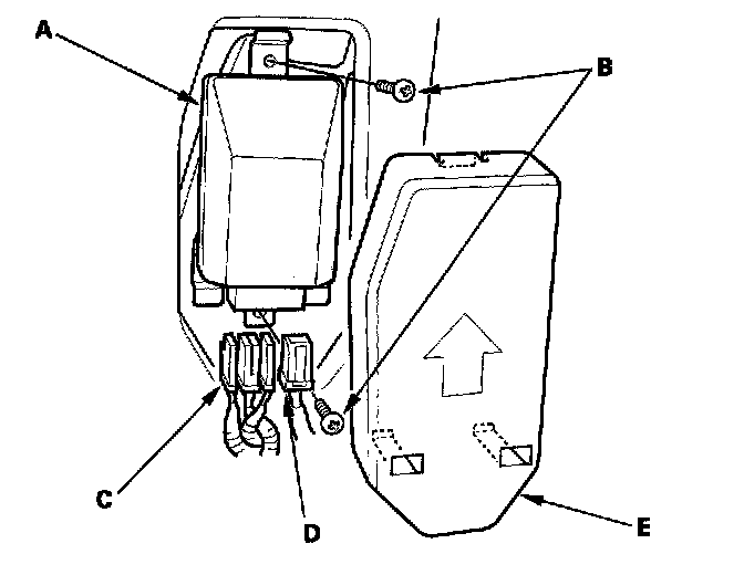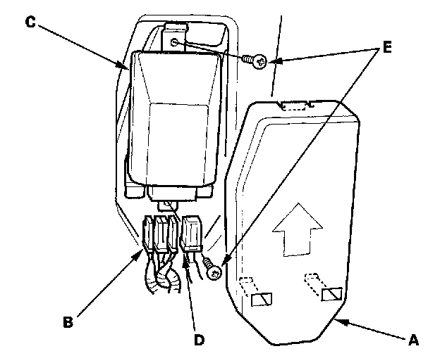 1. Place the new OPDS unit (A) on the front passenger's seat-back frame. Tighten the two screws (B), and connect the OPDS unit harness 8P connector D and sensor connectors (C) to the OPDS unit. Reinstall the cover (E).