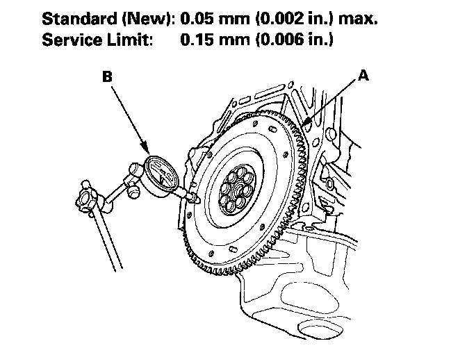 FlywheelMeasure the flywheel (A) runout using a dial indicator (B) through at least two full turns with the engine installed. Push against the flywheel each time you turn it to take up the crankshaft thrust washer clearance. If the runout is more than the service limit, replace the flywheel, and recheck the runout. Resurfacing the flywheel is not recommended.