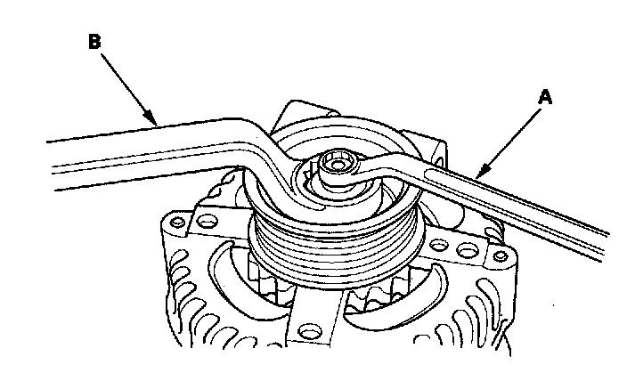 3. If the front bearing needs replacing, remove the pulley locknut with a 10 mm wrench (A) and a 22 mm wrench (B). If necessary, use an impact wrench.