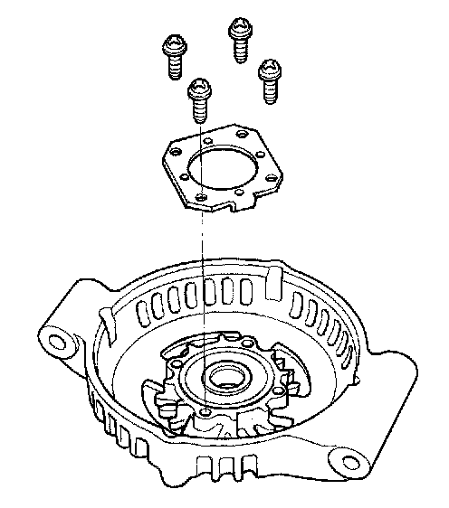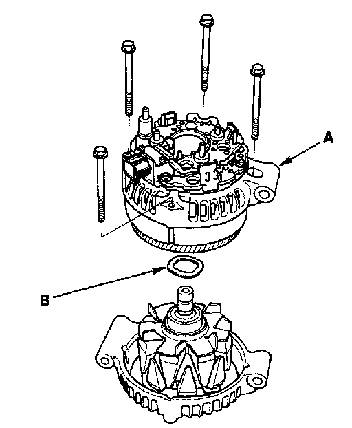 7. Remove the four bolts, then remove the rear housing assembly (A), and washer (B).
