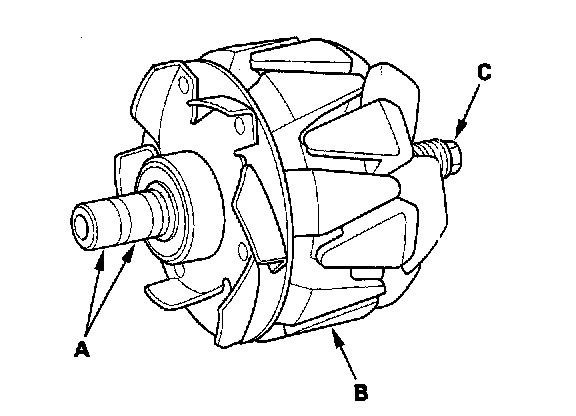 15. Check for continuity between each slip ring and the rotor (B) and the rotor shaft (C).