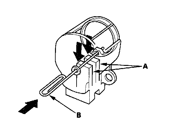 19. Push in the brushes (A), then insert a pin or drill bit (B) (about 1.6 mm (0.06 in.) diameter) to hold them there.