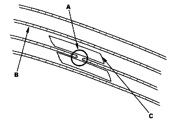 2. Carefully mask above and below the broken portion of the rear window defogger wire (B) with transparent tape (C).