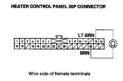 13. Measure the resistance between the No. 13 and the No. 28 terminals of the heater control panel 30P connector.