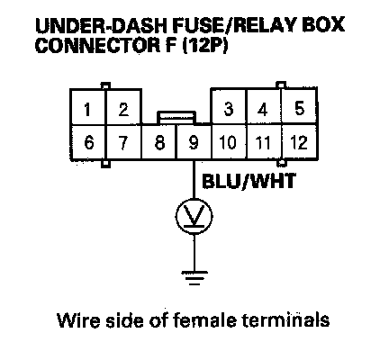 15. Using the backprobe set, measure the voltage between the No. 9 terminal of under-dash fuse/relay box connector F (12P) and body ground with the under-dash fuse/relay box connectors connected.