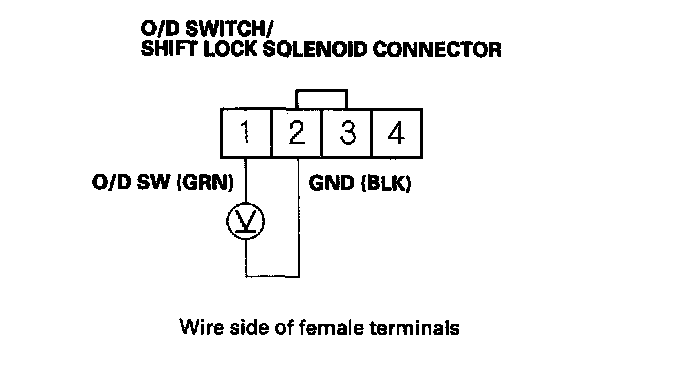 7. Measure the voltage between O/D switch/shift lock solenoid connector terminal No. 1 and body ground.