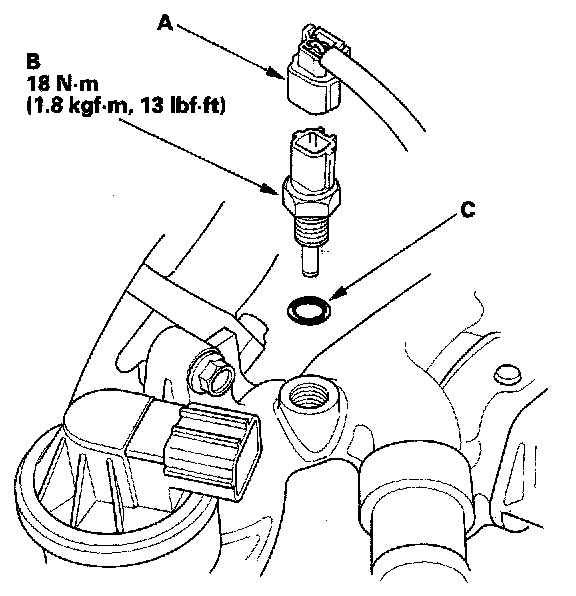 5. Install the sensor in the reverse order of removal with a new O-ring (C), then refill the radiator with engine coolant, and bleed air from the cooling system with the heater valve open.