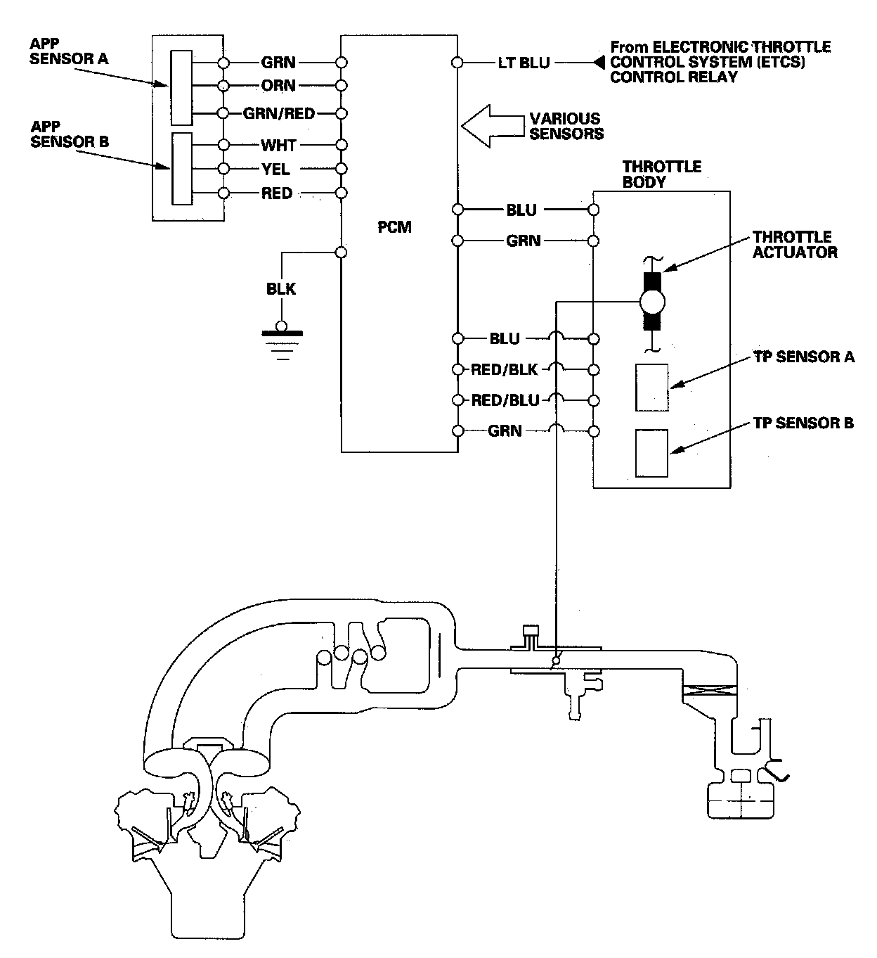 The electronic throttle control system consists of the throttle actuator, throttle position (TP) sensor A/B, accelerator pedal position (APP) sensor A/B, electronic throttle control system (ETCS) control relay, and the PCM.