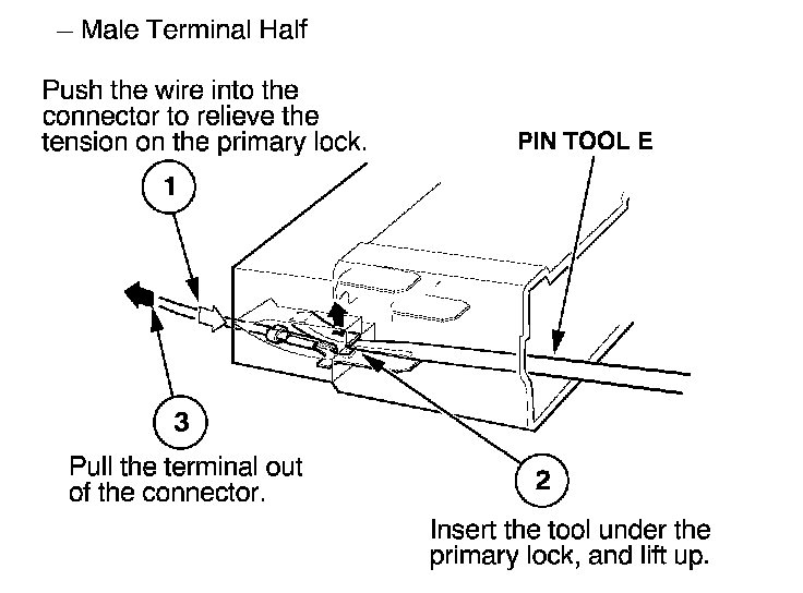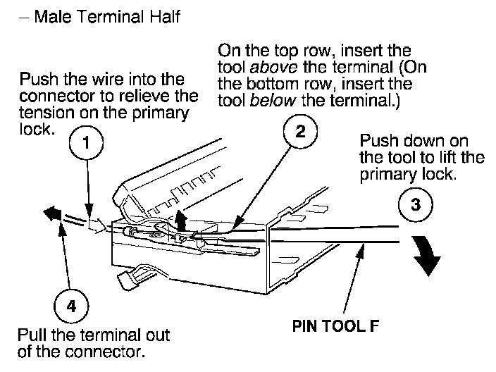 Before you begin, inspect the wire you are about to repair for damage and length. Make sure the wire will be long enough to make a terminal repair without stretching it when you reinstall the terminal in the connector. If the wire is too short, or if access to the connector is too restricted to make a terminal repair, you may need to install a pigtail terminal (a short length of wire with a factory-crimped terminal on it). Refer to HOW TO INSTALL PIGTAIL TERMINALS.