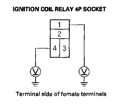 3. Measure the voltage between ignition coil relay 4P socket terminal No. 1 and body ground, then terminal No. 4 and body ground.