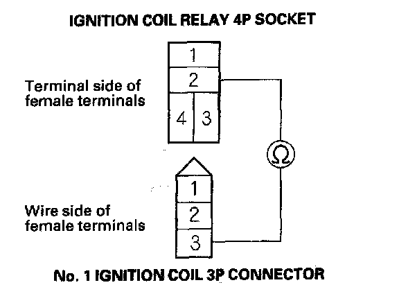 4. Check for continuity between ignition coil relay 4P socket terminal No. 2 and No. 1 ignition coil 3P connector terminal No. 3.