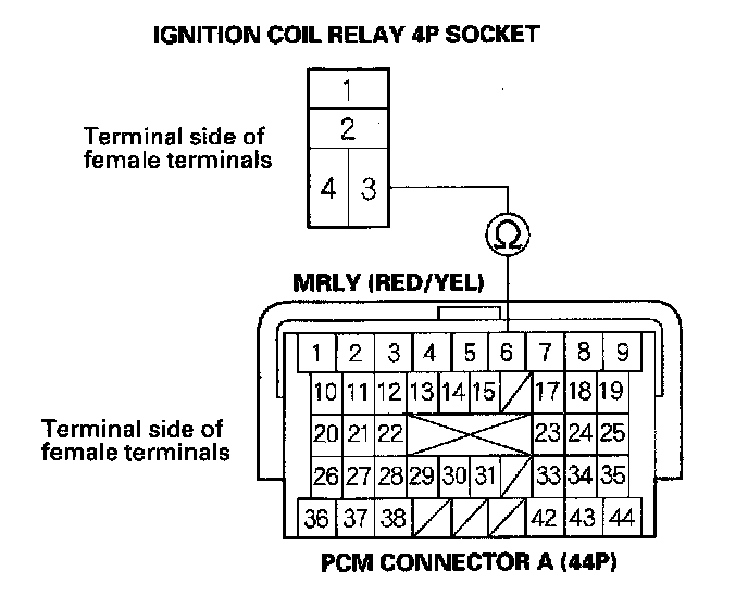 NO - Repair an open in the wire between ignition coil relay 4P socket terminal No. 3 and the PCM (A6).