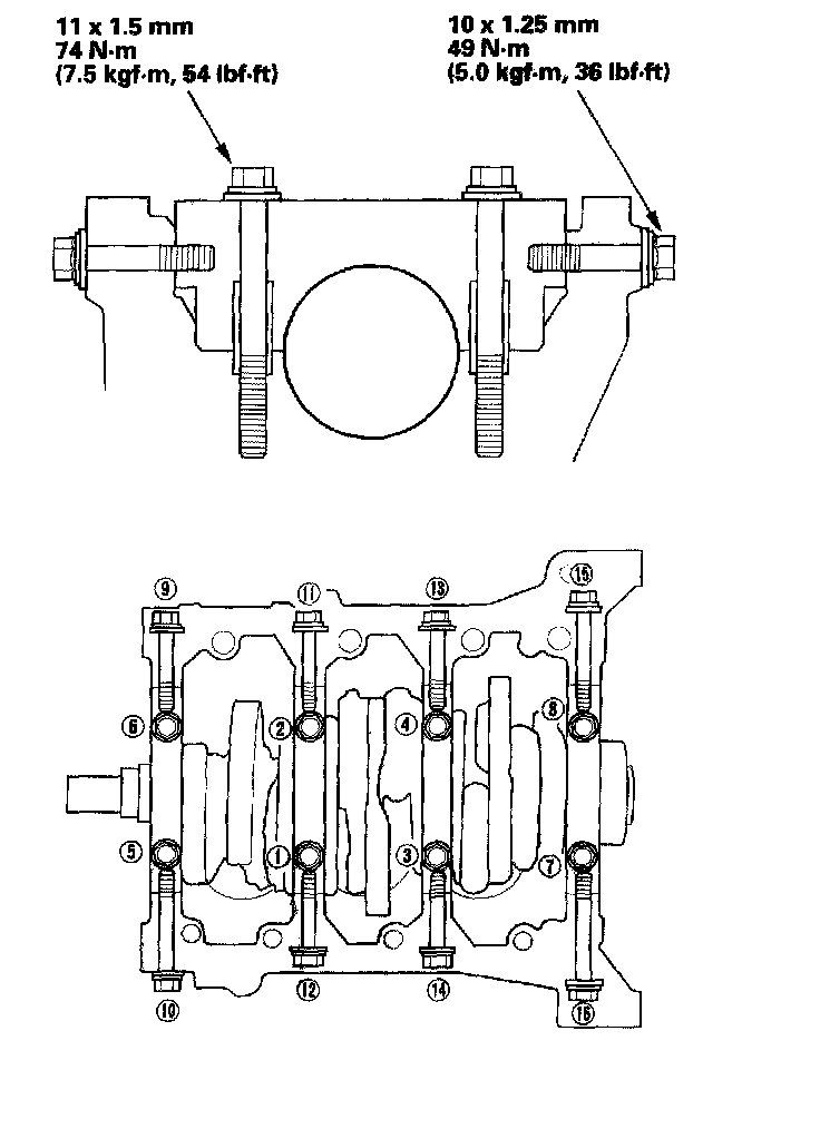 Crankshaft Bearing CapTighten the bearing cap bolts, and then the bearing cap side bolts to the specified torque in the sequence as shown. Repeat the torque sequence again to measure the bolts are properly torqued.