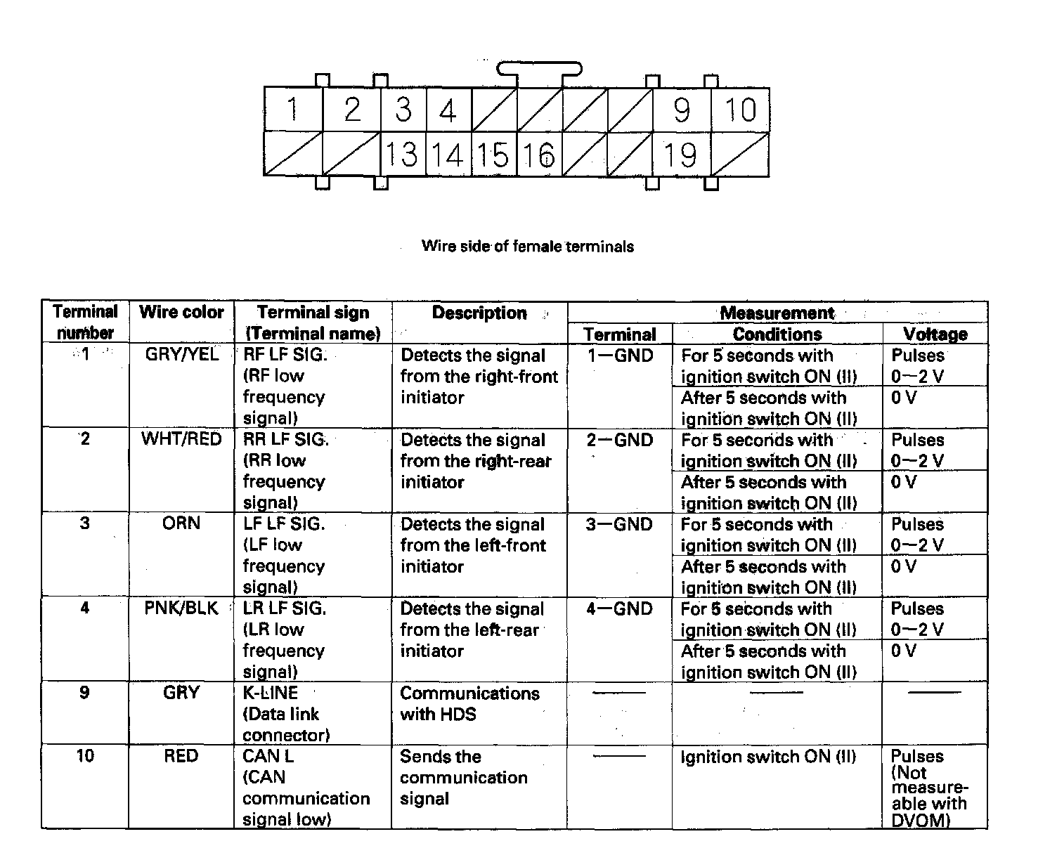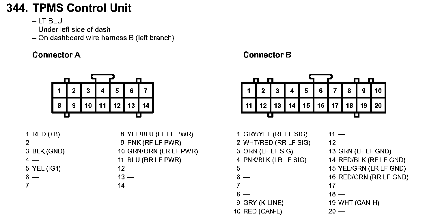 TPMS Control Unit Inputs and Outputs for Connector B (20P):