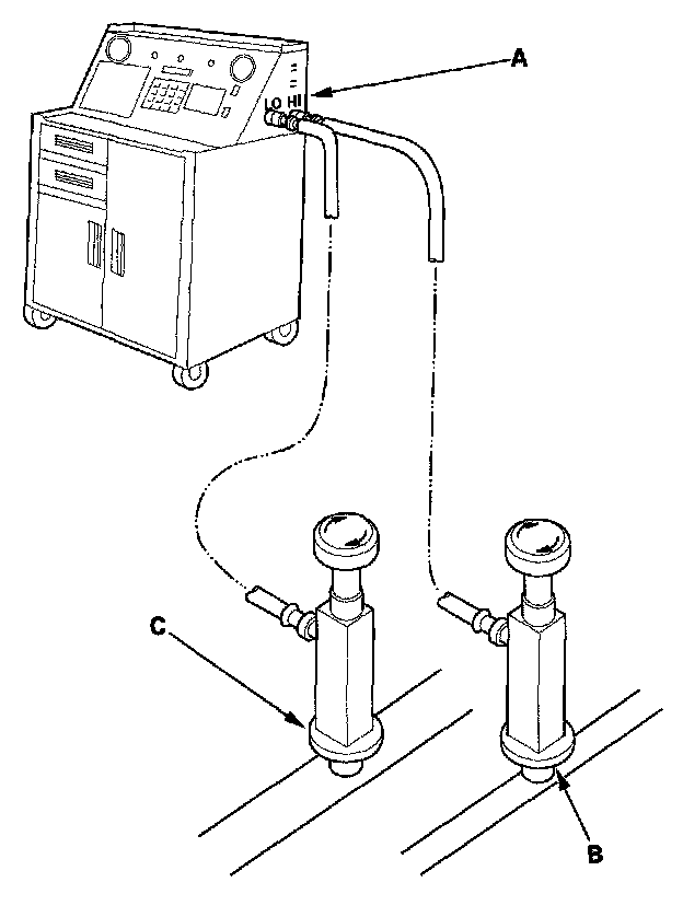 1. Connect an R-134a refrigerant recovery/recycling/charging station (A) to the high-pressure service port (B) and the low-pressure service port (C), as shown, following the equipment manufacturer's instructions.