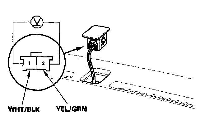 Turn the ignition switch ON (II). Measure the voltage between the terminals with the (+) probe on the No. 1 terminal and the (-) probe on the No. 2 terminal with the 2P connector connected. The voltage readings will not change under the light of a flashlight or a fluorescent lamp. Voltage should be: