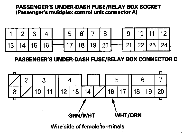 8. With the passenger's multiplex control unit still disconnected, make these input tests at the connector and passenger's under-dash fuse/relay box socket.