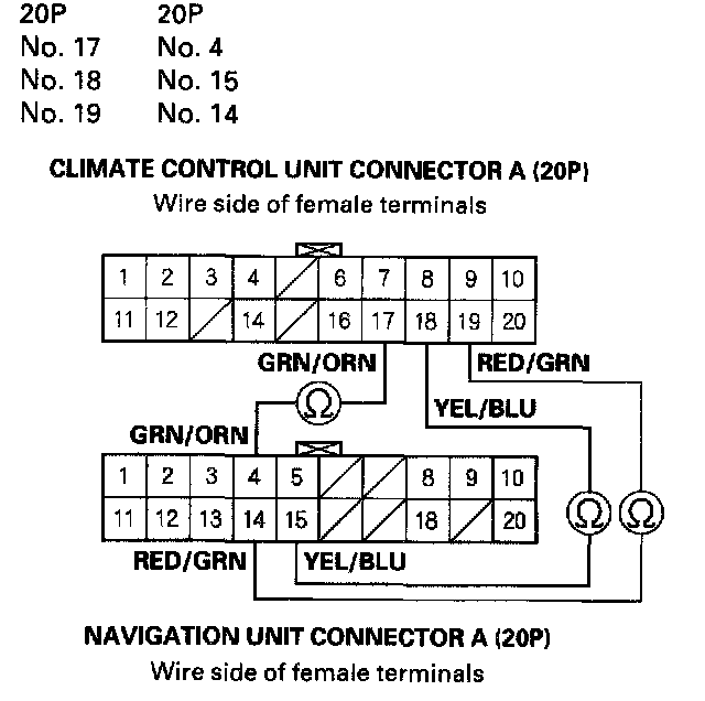 NO - Check for loose wire or poor connections at climate control unit connector A (20P) and at the navigation unit connector A (20P). If the connections are good, substitute a known-good climate control unit and/or navigation unit, and recheck. If the symptom/indication goes away, replace the original climate control unit and/or navigation unit.